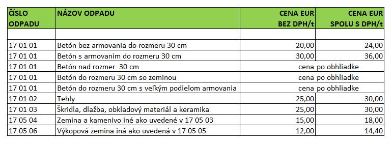 Cenník za prevzatie odpadu do zariadenia na zber odpadov platný od 9.5.2022